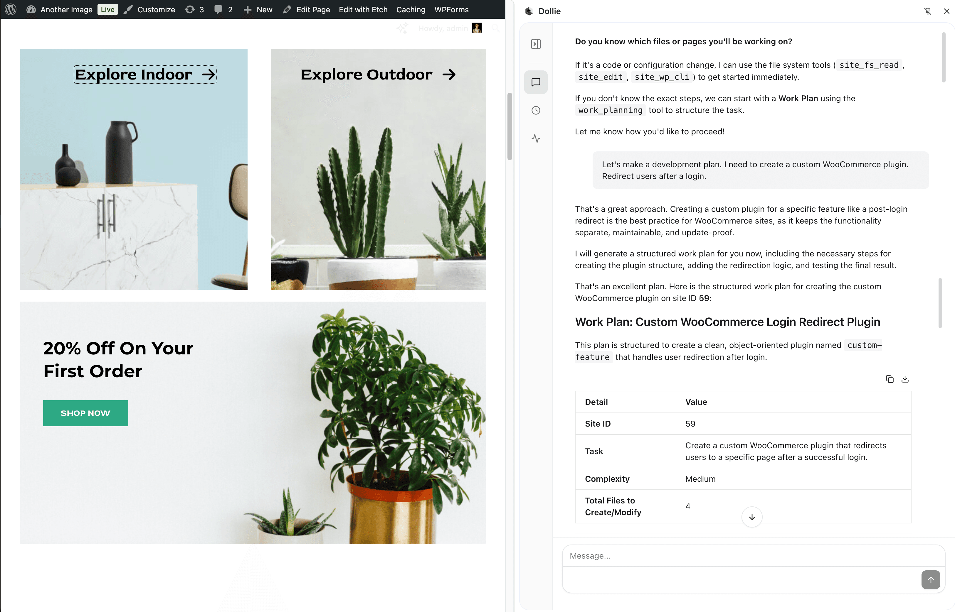 Dollie agents don't just answer questions. They build plugins, debug live sites, run portfolio-wide updates, and prototype entire projects — inside workspaces that already know your clients.